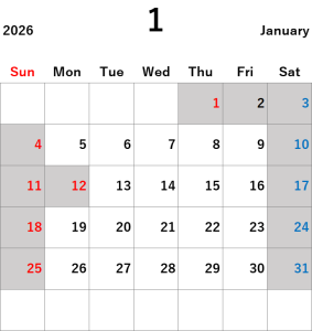 平素より当社をご利用いただき、誠にありがとうございます。 2026年1月~3月の営業日は、土日・祝日を除く平日は通常どおり営業しております。